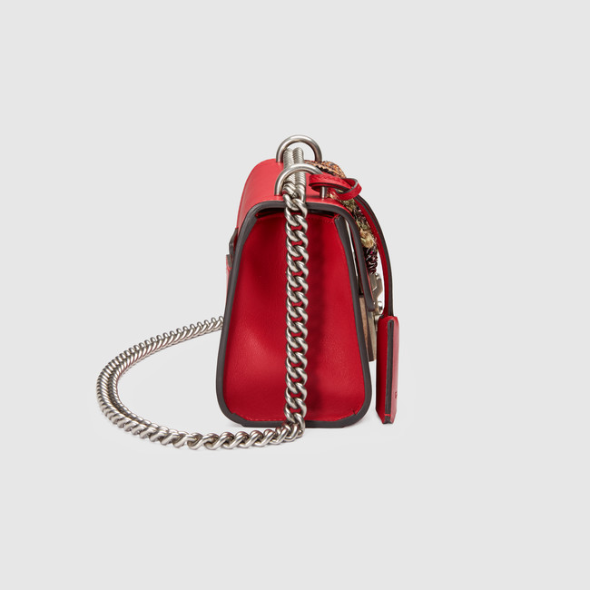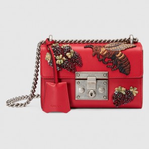 A small structured bag with a key lock closure. The sliding chain strap can be worn multiple ways, changing between a shoulder and a top handle bag. Made in our fine grain leather, noted for its shine and softness with embroidered tiger and strawberry appliques.