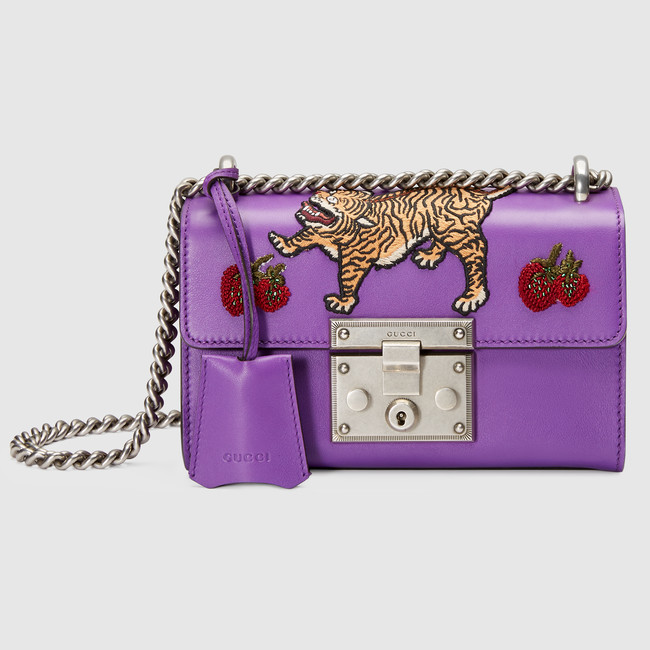 A small structured bag with a key lock closure. The sliding chain strap can be worn multiple ways, changing between a shoulder and a top handle bag. Made in our fine grain leather, noted for its shine and softness with embroidered tiger and strawberry appliques.