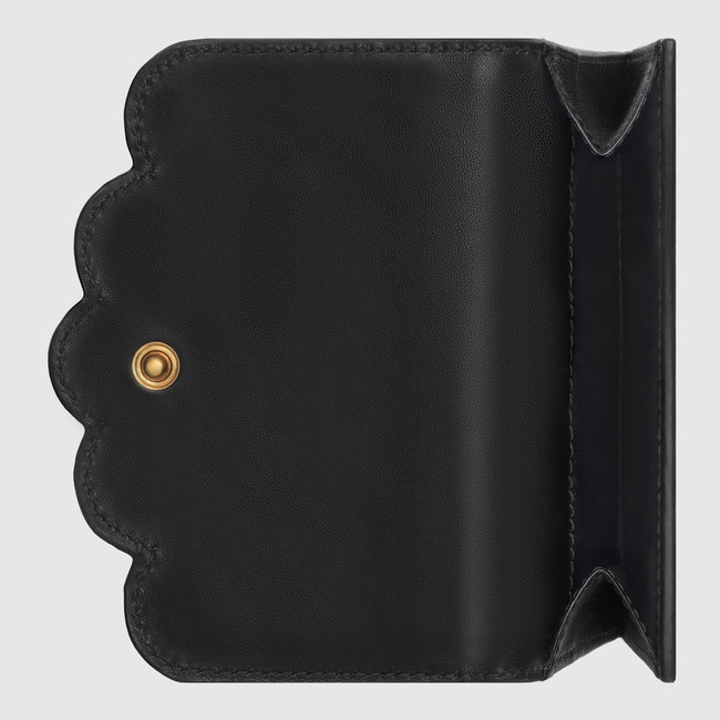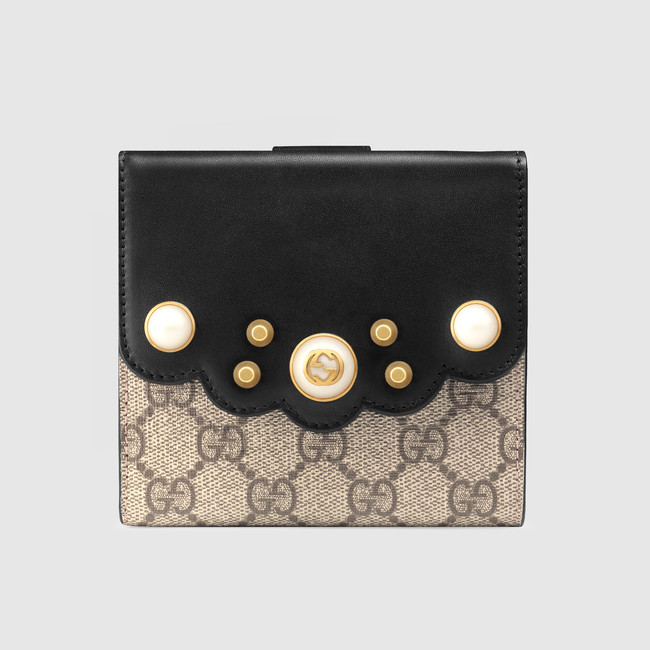 A french flap wallet with gold toned studs and glass pearl studs made in our GG Supreme canvas with a scalloped leather edge.