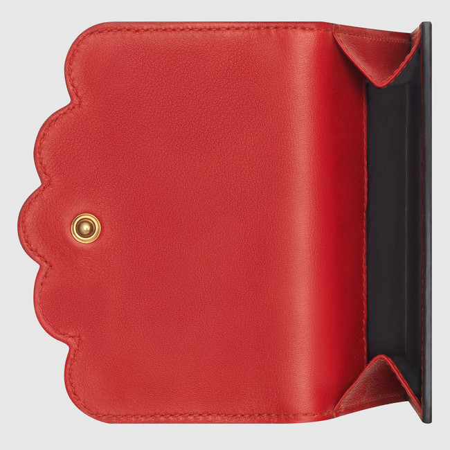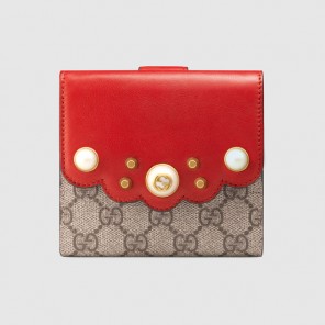 A french flap wallet with gold toned studs and glass pearl studs made in our GG Supreme canvas with a scalloped leather edge.