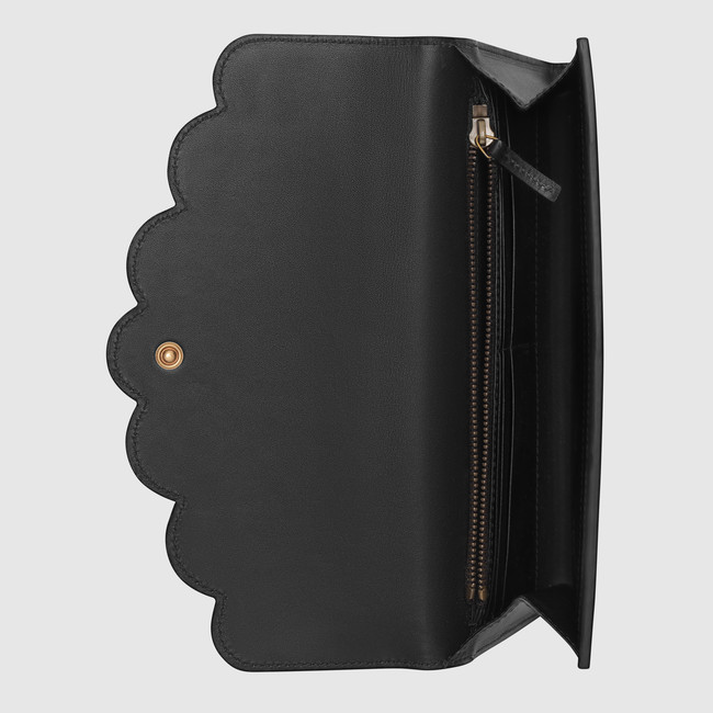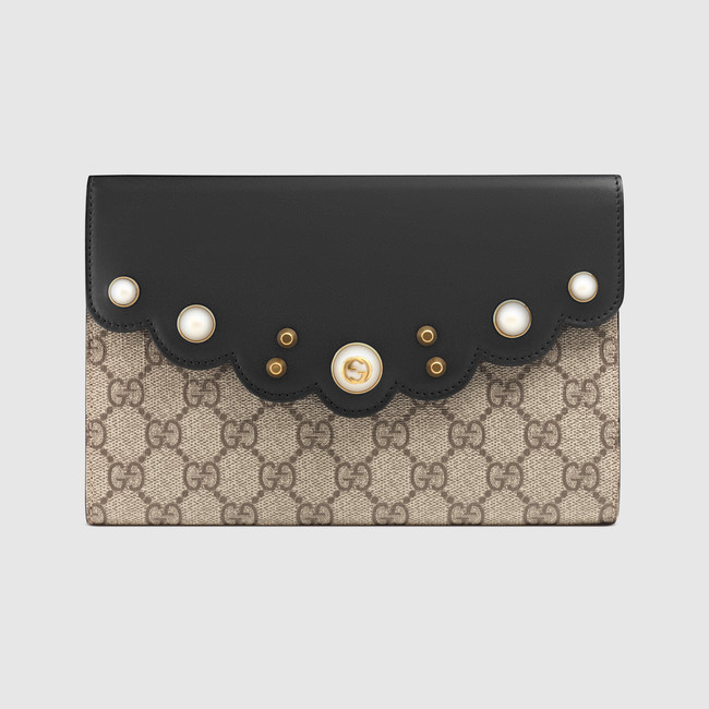 A pouch with studs and glass pearl studs made in our GG Supreme canvas with a scalloped leather edge.