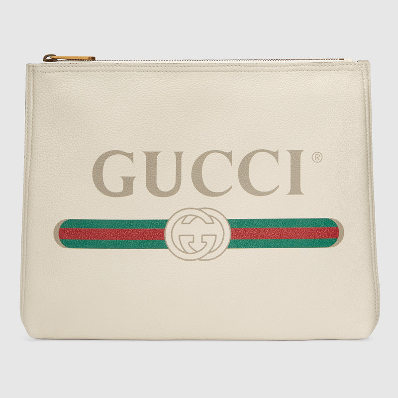 Inspired by vintage prints from the eighties, the Gucci logo is brought to the forefront. The retro-style motif is presented on the front of a medium-sized portfolio in supple, textured leather.