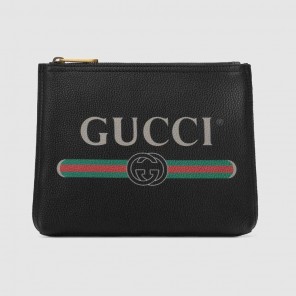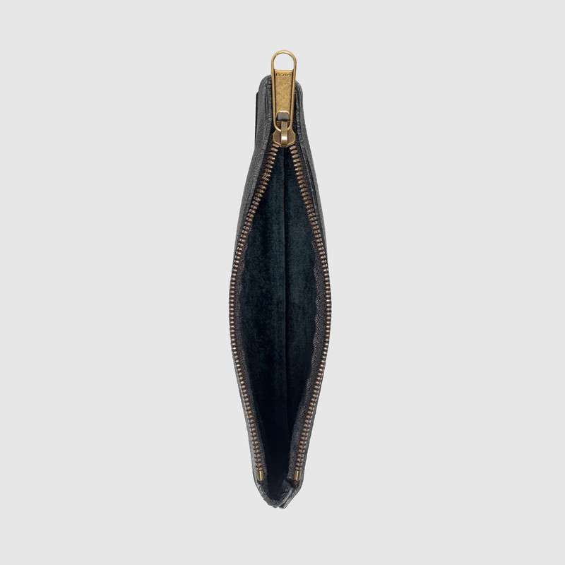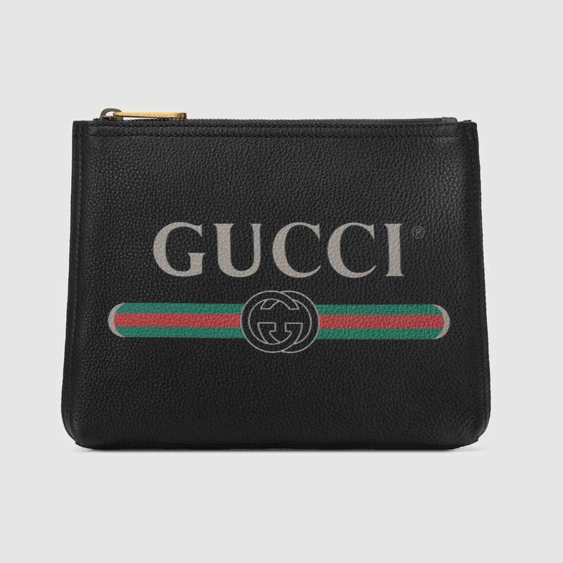 Inspired by vintage prints from the eighties, the Gucci logo is brought to the forefront. The retro-style motif is presented on the front of a portfolio in supple, textured leather. The construction is incredibly soft and can be folded in half and used as a clutch, or placed in larger bags and used as a pouch.