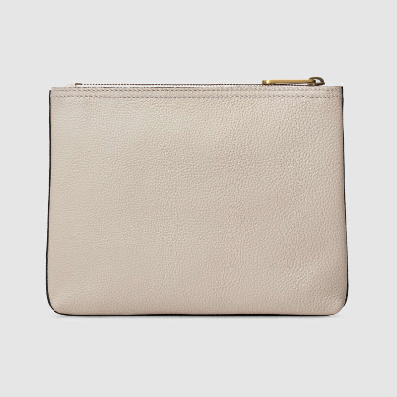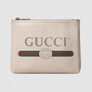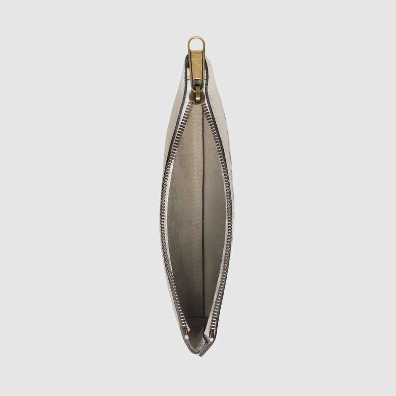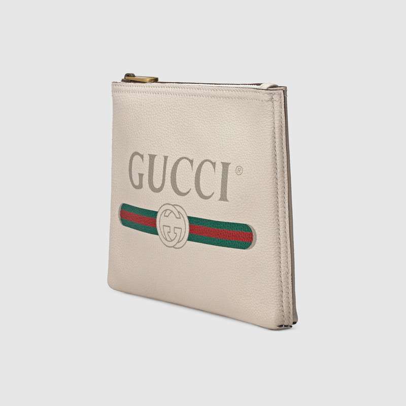 Inspired by vintage prints from the eighties, the Gucci logo is brought to the forefront. The retro-style motif is presented on the front of a portfolio in supple, textured leather. The construction is incredibly soft and can be folded in half and used as a clutch, or placed in larger bags and used as a pouch.