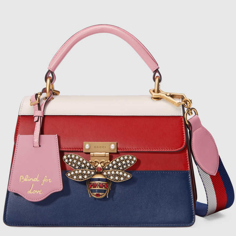 The Queen Margaret line mixes iconic Gucci details with newly established codes. The bee, thought to be a symbol of wisdom and love is enriched by glass pearls and multicolor crystals. An ID holder with gold embossed "Blind for Love", a reference to inclusive romanticism, hangs over the top handle. Made in smooth leather with a slight shine in a color block design.