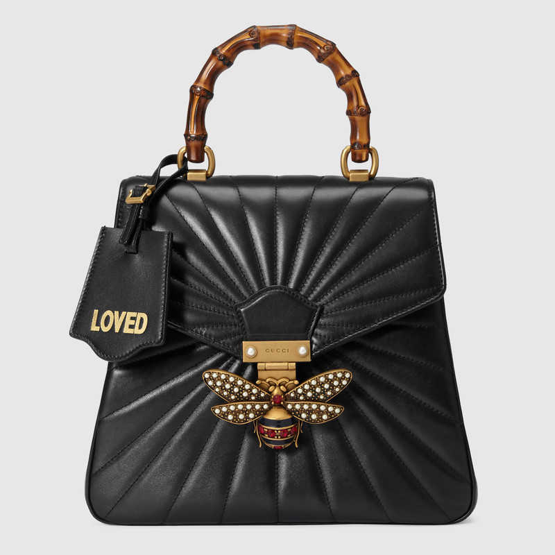 The Queen Margaret line mixes iconic Gucci details with newly established codes. The bee, thought to be a symbol of wisdom and love is enriched by glass pearls and multicolor crystals. An ID holder with gold embossed "Loved", a reference to inclusive romanticism, hangs over the iconic bamboo handle. Made in a soft quilted leather.