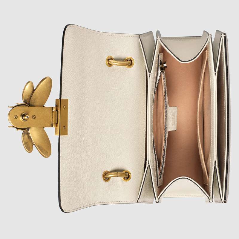 An eclectic mixture of historical Gucci details and newly established codes, the Queen Margaret line is presented in GG canvas, a versatile fabric that continues to pay homage to the House's roots. Inspired by the '70s archives, a bee enriched by glass pearls and multicolor crystals defines the closure of this small top handle bag, trimmed in white leather.