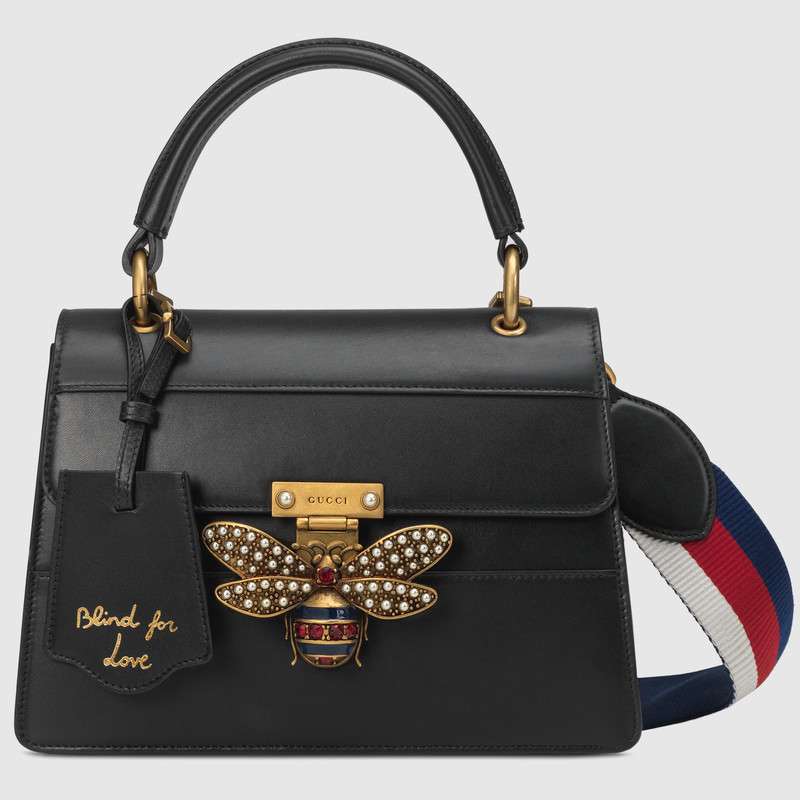 The Queen Margaret line mixes iconic Gucci details with newly established codes. The bee鈥攁 historical Gucci code taken from the '70s archives鈥攊s enriched by glass pearls and multicolor crystals. An ID holder with gold embossed "Blind for Love", a reference to inclusive romanticism, hangs over the top handle. Made in smooth leather with a slight shine.