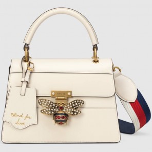 The Queen Margaret line mixes iconic Gucci details with newly established codes. The bee鈥攁 historical Gucci code taken from the '70s archives鈥攊s enriched by glass pearls and multicolor crystals. An ID holder with gold embossed "Blind for Love", a reference to inclusive romanticism, hangs over the top handle. Made in smooth leather with a slight shine.