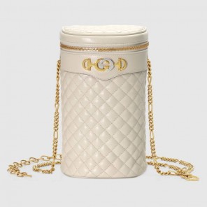 The evolution of the belt bag continues with a new shape for Spring Summer 2019. In an elongated design reminiscent of a bottle carrier, the quilted leather pouch is completed with the Interlocking G Horsebit. Detachable chain straps allow the style to be worn as a belt bag, a shoulder bag or used as a pouch.