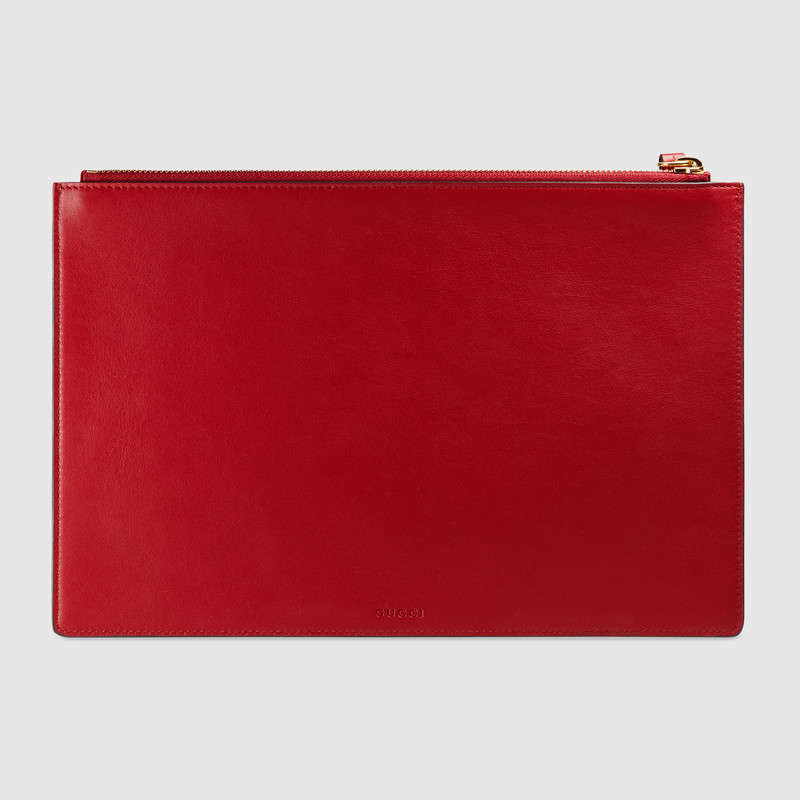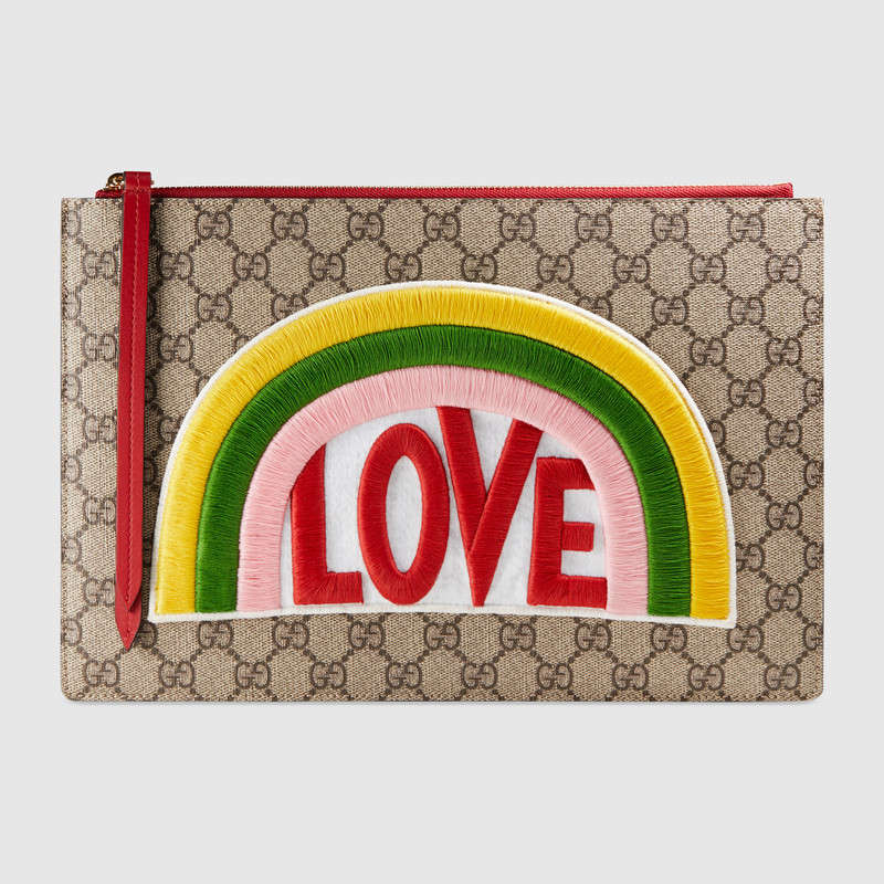 Each season the GG motif is enriched with new appliques and motifs. Gucci introduces the rainbow and "Love" applique for Pre-Fall 2017. This new motif represents an inclusive idea of love and acceptance and it appears at the center of a pouch made in GG Supreme canvas, a material with low environmental impact.