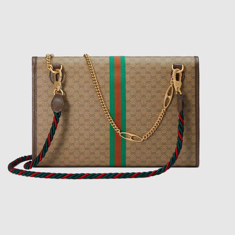 An addition to the Rajah line for Spring Summer 2019, the medium shoulder bag is introduced in mini GG Supreme canvas鈥攁 new take on the signature pattern with a vintage look that is heightened with the green and orange Web. Featuring the collection's colored enamel and crystal tiger head, inspired by a vintage piece from legendary fashion and jewelry designer Hattie Carnegie's 1940s archives, the bag is designed with two straps: one short chain strap and a longer shoulder strap in the House's signature green and red Web colors.