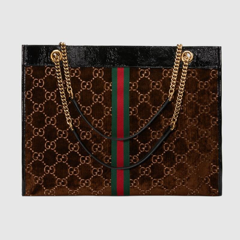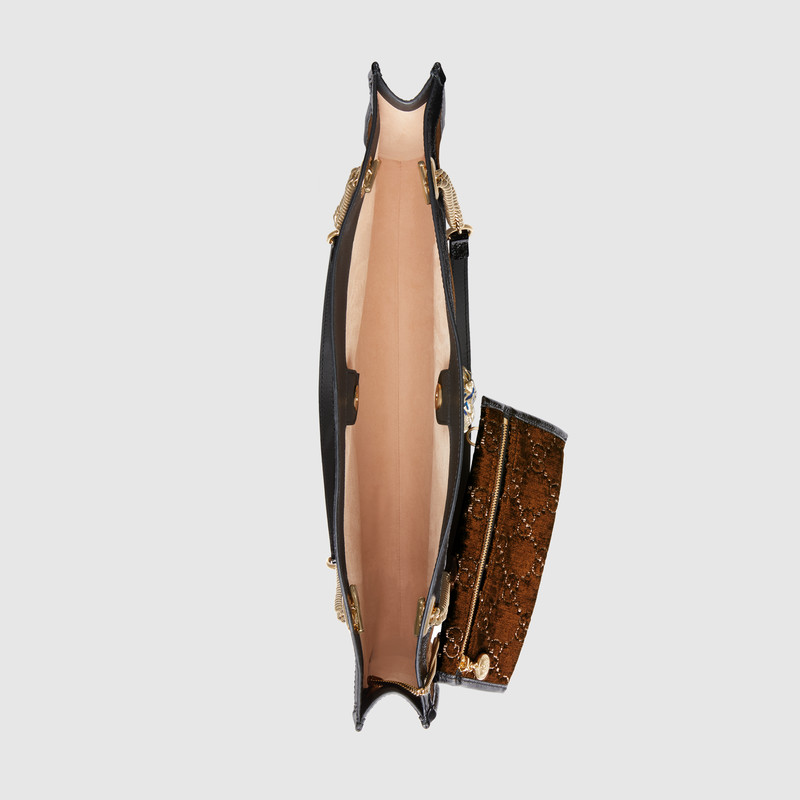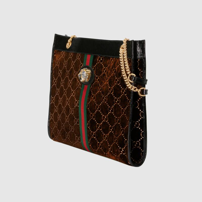 Now synonymous with the Rajah line, the tiger head, finished with colored enamel and sparkling crystals, is inspired by a vintage piece from legendary fashion and jewelry designer Hattie Carnegie's 1940s archives. For Spring Summer 2019, the detail has continued to define this line of retro-inspired handbags.