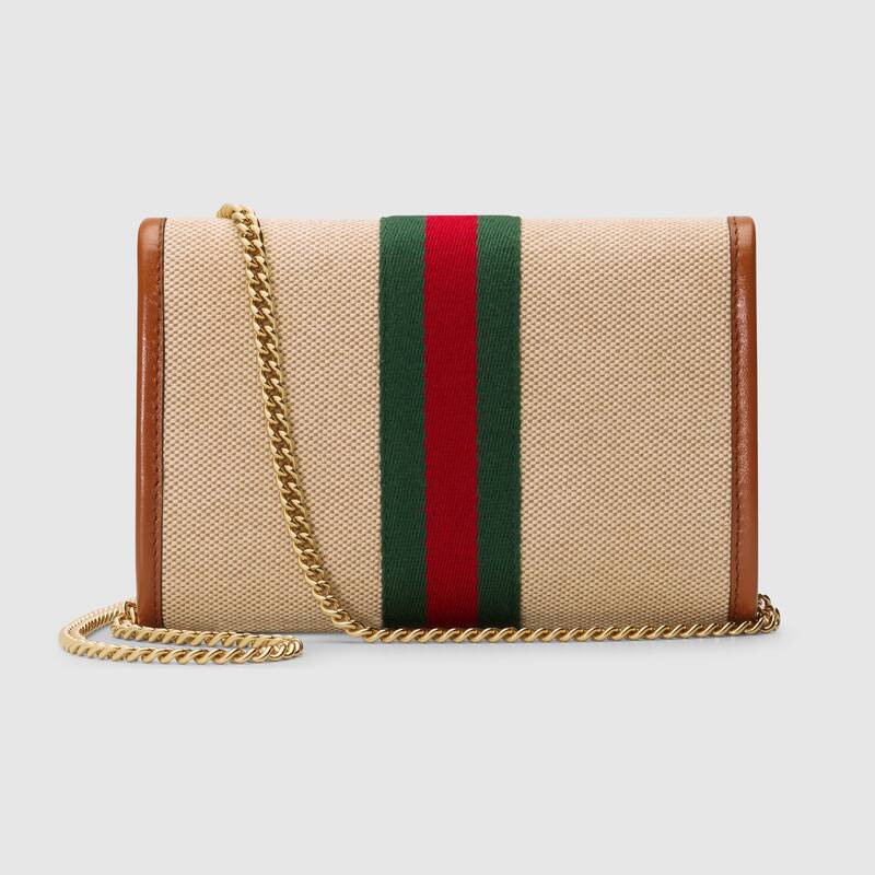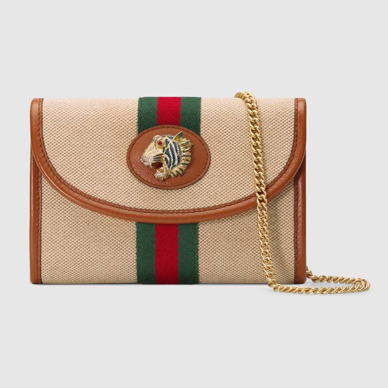 A mini bag crafted from a woven vintage inspired canvas. The Rajah universe continues to evolve with new iterations each season. Defined by the combination of the House Web and the enameled tiger head, inspired by a vintage piece from fashion and jewelry designer Hattie Carnegie鈥檚 1940s archives, the accessory is finished by a detachable chain strap. New shapes and signature Gucci lines are reimagined in a mix of fabrics and trims imbued with an inherently summer feel.