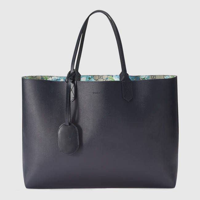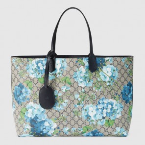 First appearing in the Fall Winter 2015 women鈥檚 fashion show, our distinctive blooms motif is presented for the first time in blue. This tapestry inspired print evokes the look of a canvas painting, printed on one size of our large tote. Made in innovative reversible leather, patented exclusively to Gucci. The reverse side is in solid blue.