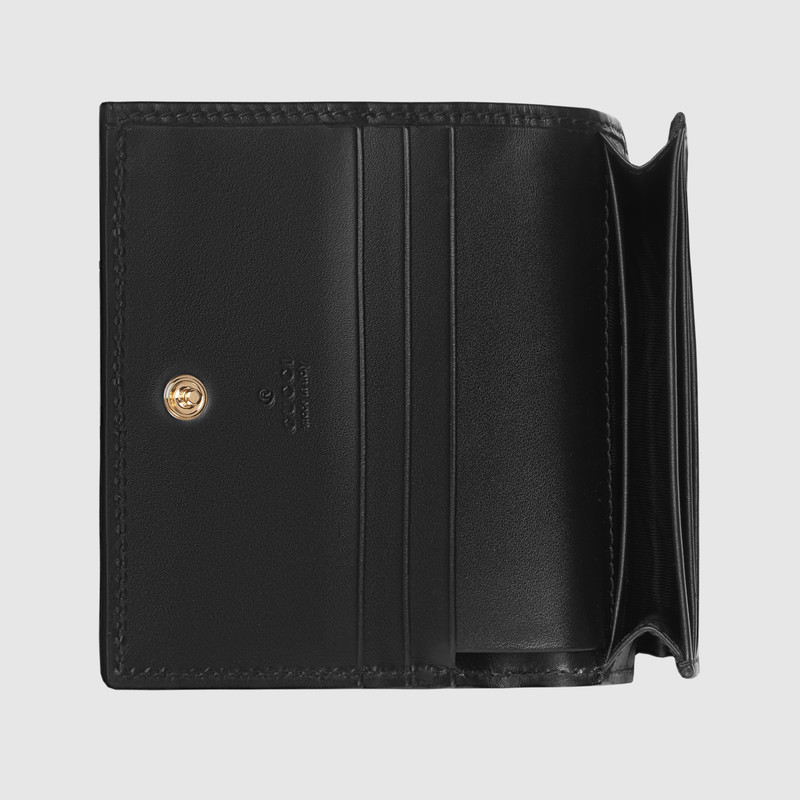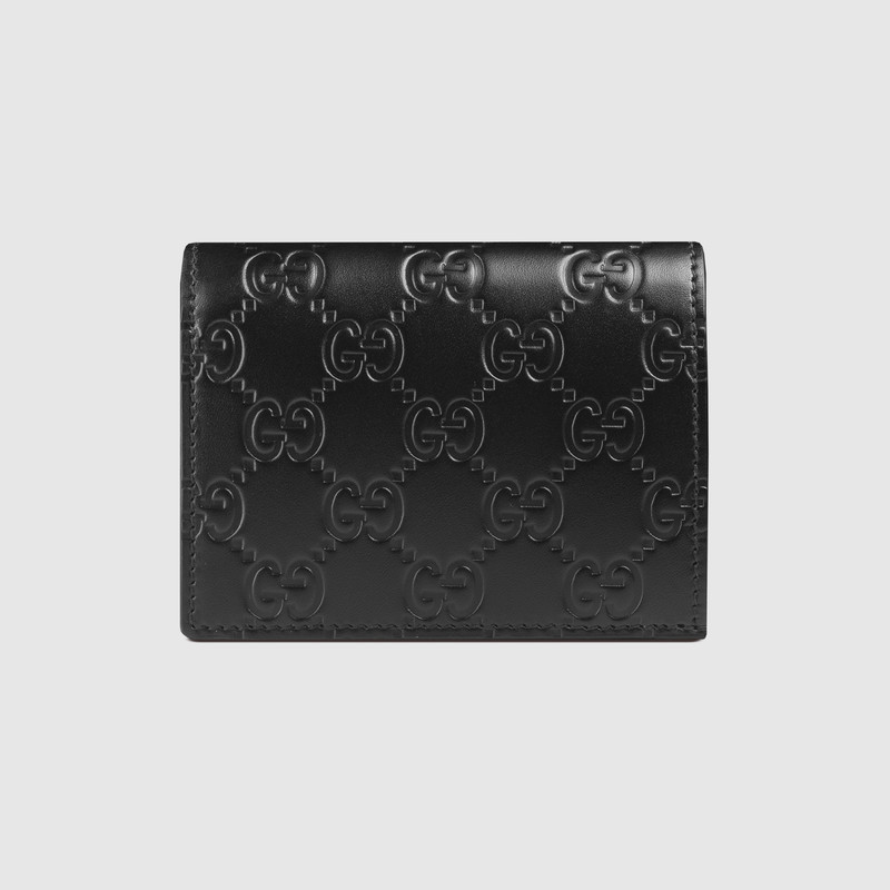 A sleek card case with bill compartment, side pocket, four card slots and flat pockets. Made in heat debossed Gucci Signature leather resulting in a defined print with a firm texture.