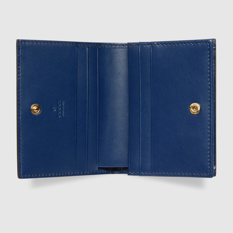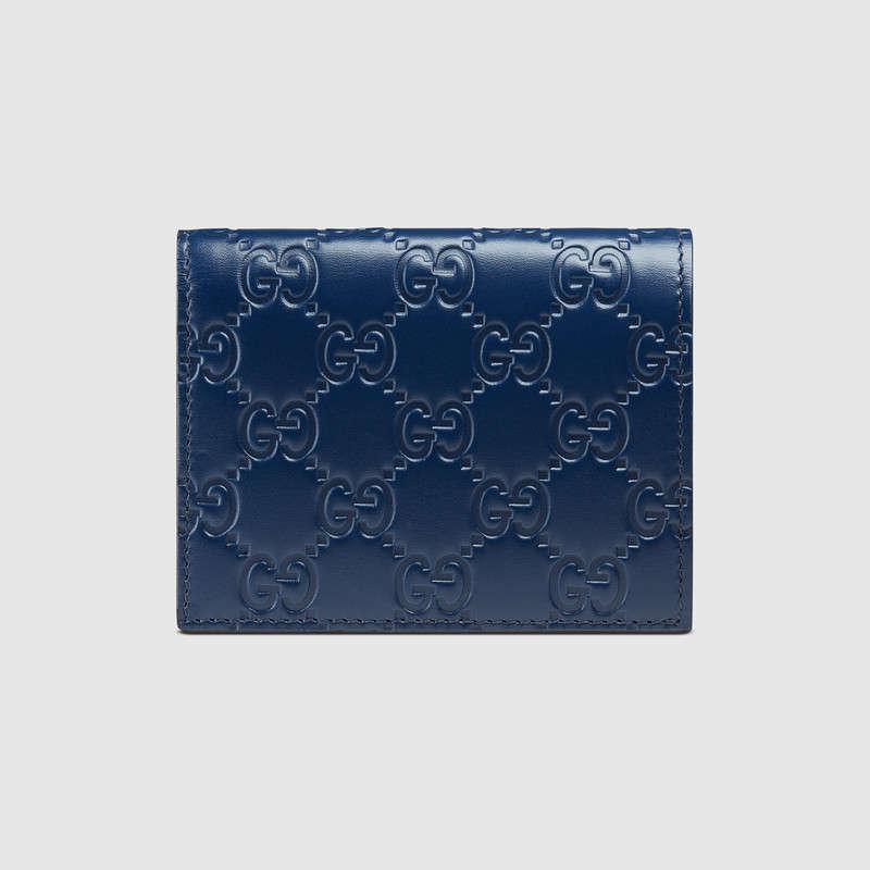 A sleek card case with bill compartment, side pocket, four card slots and flat pockets. Made in heat debossed Gucci Signature leather resulting in a defined print with a firm texture.
