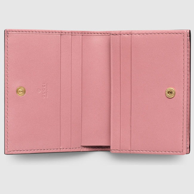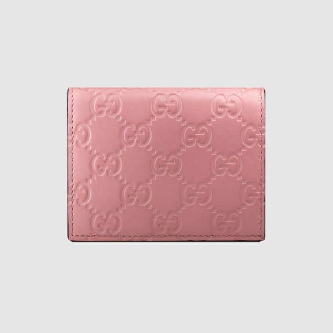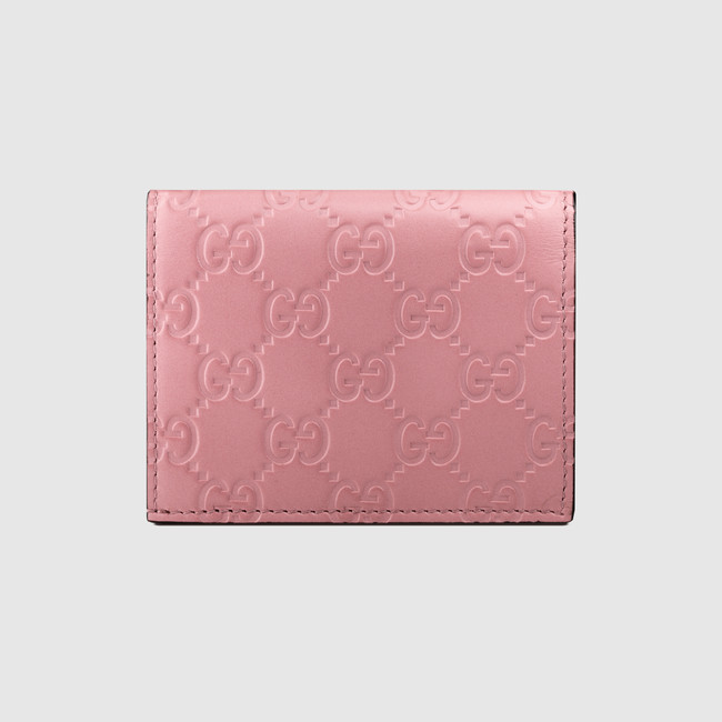 A sleek card case with bill compartment, side pocket, four card slots and flat pockets. Made in our heat embossed Gucci Signature leather resulting in a defined print with a firm texture.