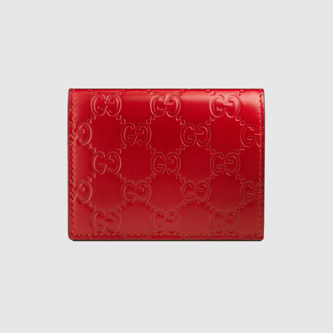 A sleek card case with bill compartment, side pocket, four card slots and flat pockets. Made in our heat embossed Gucci Signature leather resulting in a defined print with a firm texture.