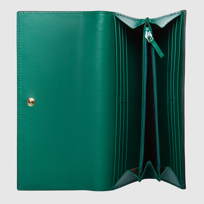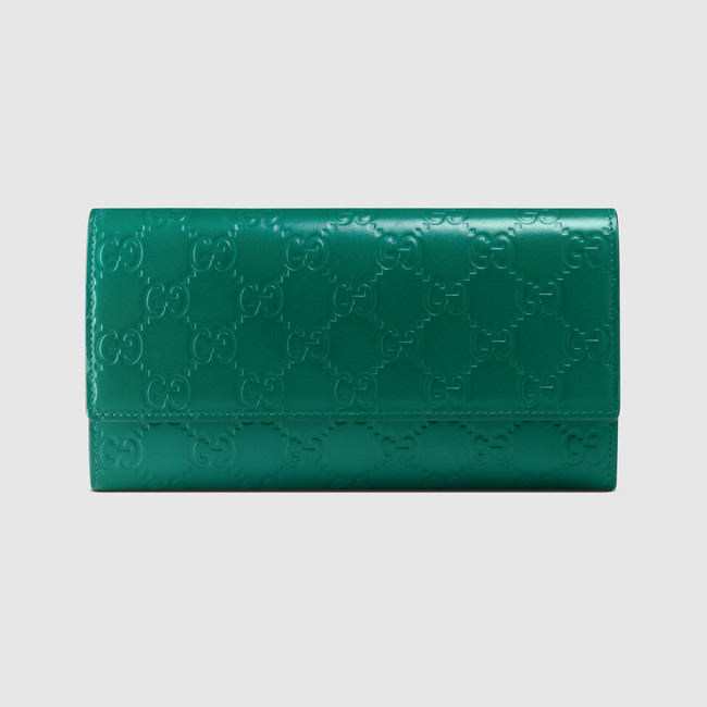 A continental wallet with a flap and snap closure. Made in our heat embossed Gucci Signature leather resulting in a defined print with a firm texture.
