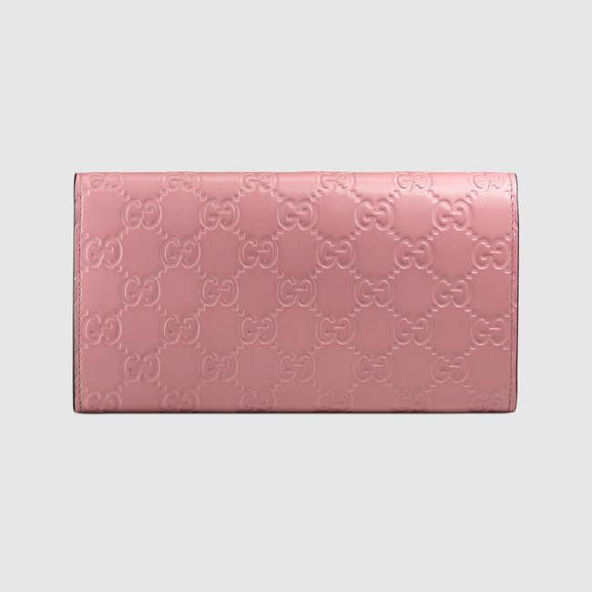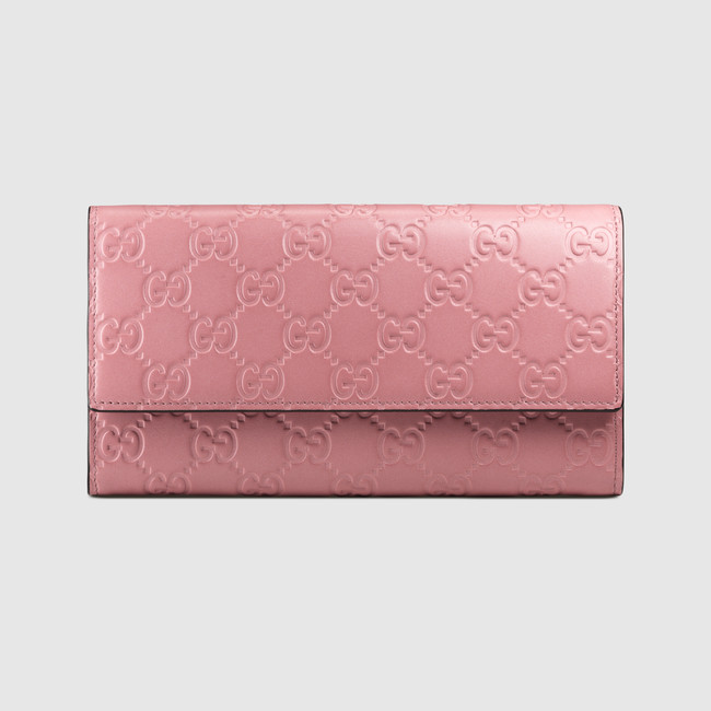 A continental wallet with a flap and snap closure. Made in our heat embossed Gucci Signature leather resulting in a defined print with a firm texture.