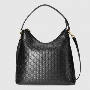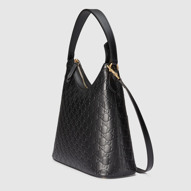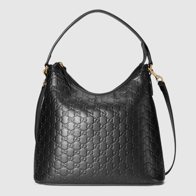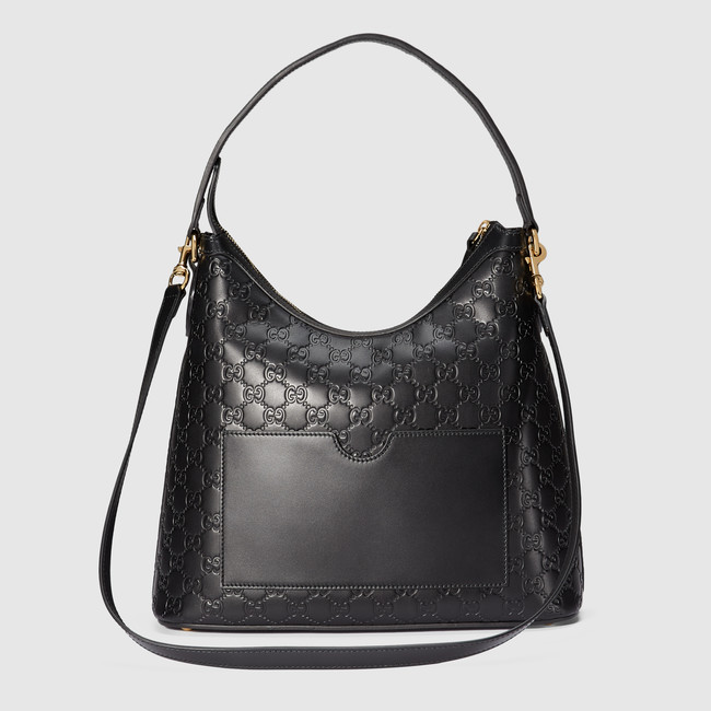A large hobo with an external back pocket detail. The handle has been hand-stitched with a padded base. Made in our heat embossed Gucci Signature leather resulting in a defined print with a firm texture.