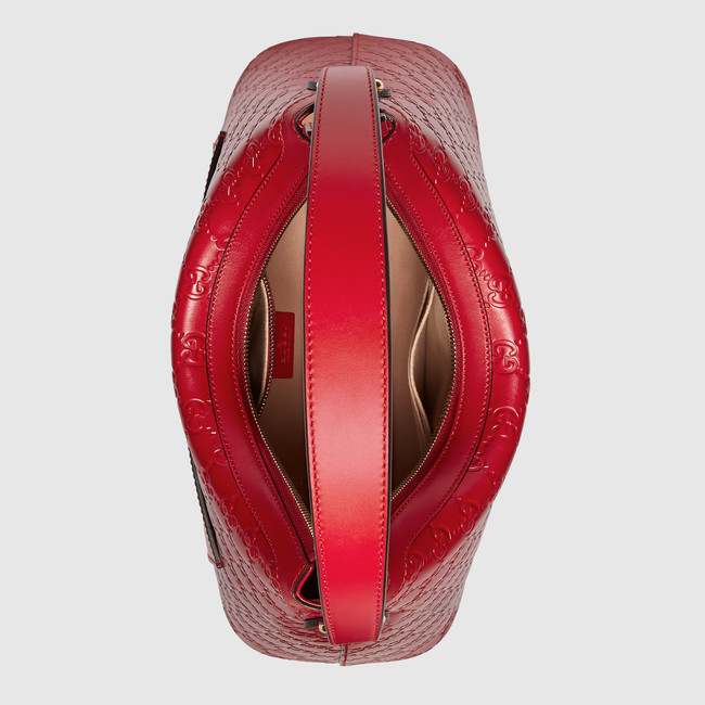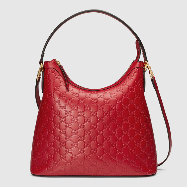 A large hobo with an external back pocket detail. The handle has been hand-stitched with a padded base. Made in our heat embossed Gucci Signature leather resulting in a defined print with a firm texture.