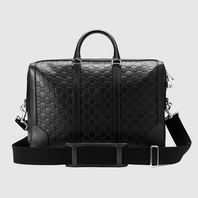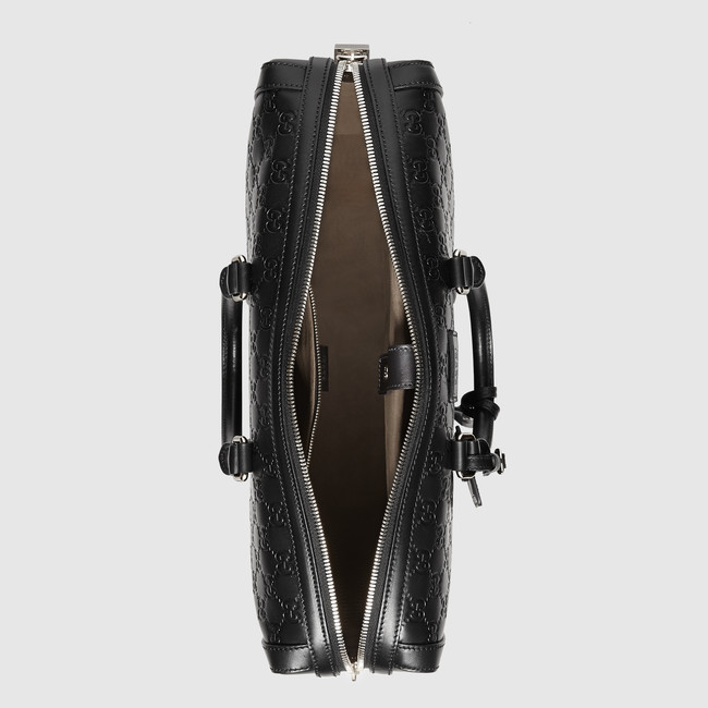 A structured briefcase with secure double zip and key lock closure. The interior organizational components include multiple pockets, smartphone compartments and a padded laptop sleeve. Made in our heat embossed Gucci Signature leather resulting in a defined print with a firm texture.