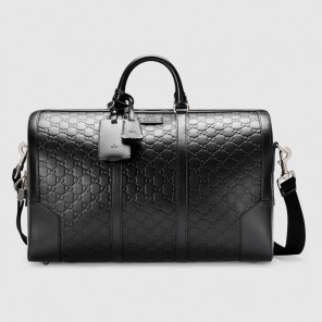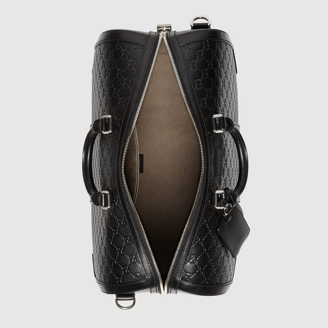 A carry-on duffle with a secure zip and key lock closure. Equipped with durable leather handles and an adjustable shoulder strap. Made in our heat embossed Gucci Signature leather resulting in a defined print with a firm texture.
