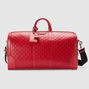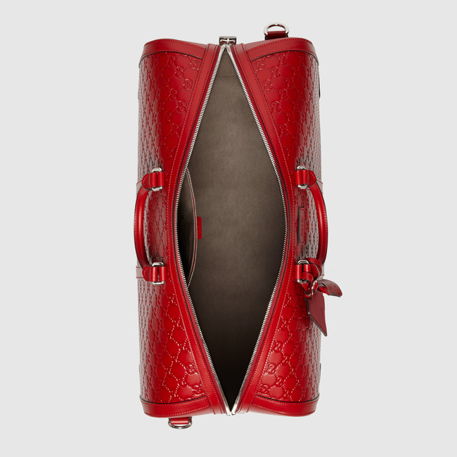 A large duffle with secure double zip and key lock closure. Equipped with durable leather handles and an adjustable shoulder strap. Made in our heat embossed Gucci Signature leather resulting in a defined print with a firm texture.