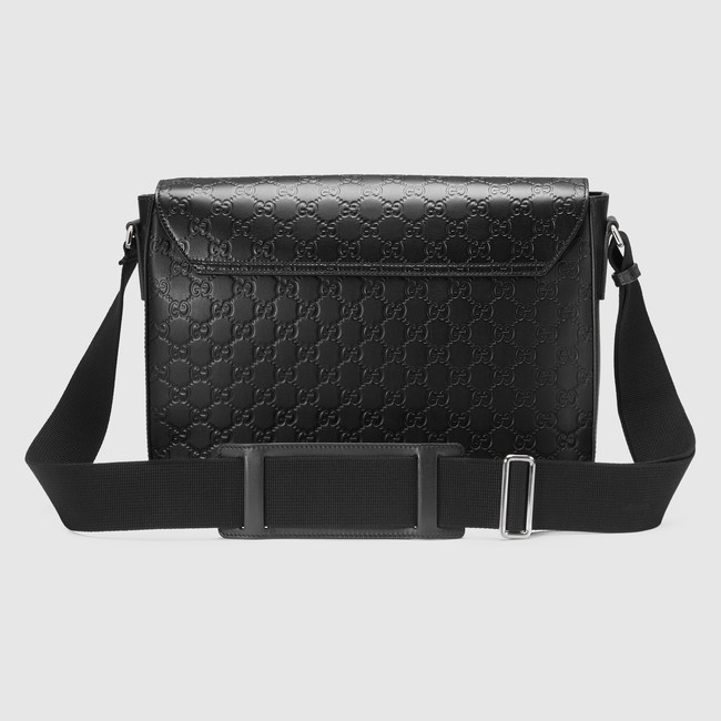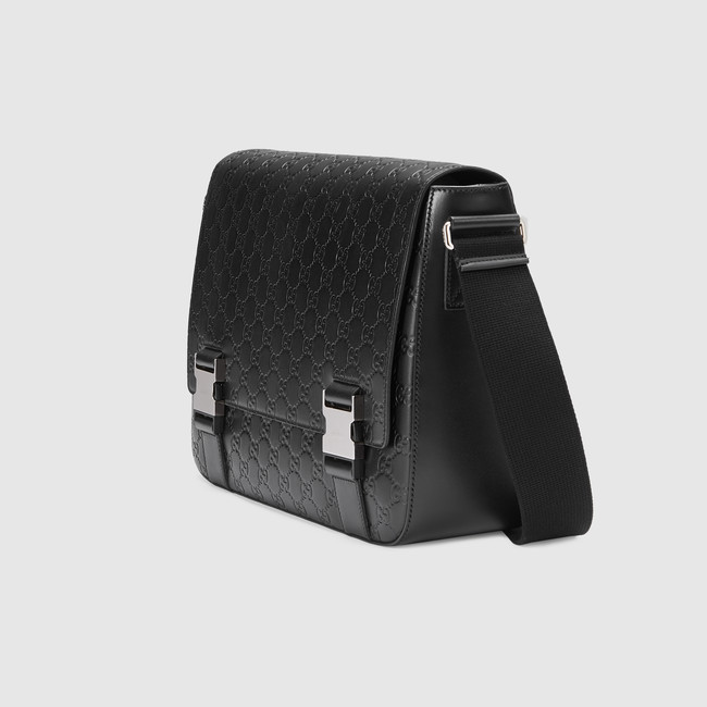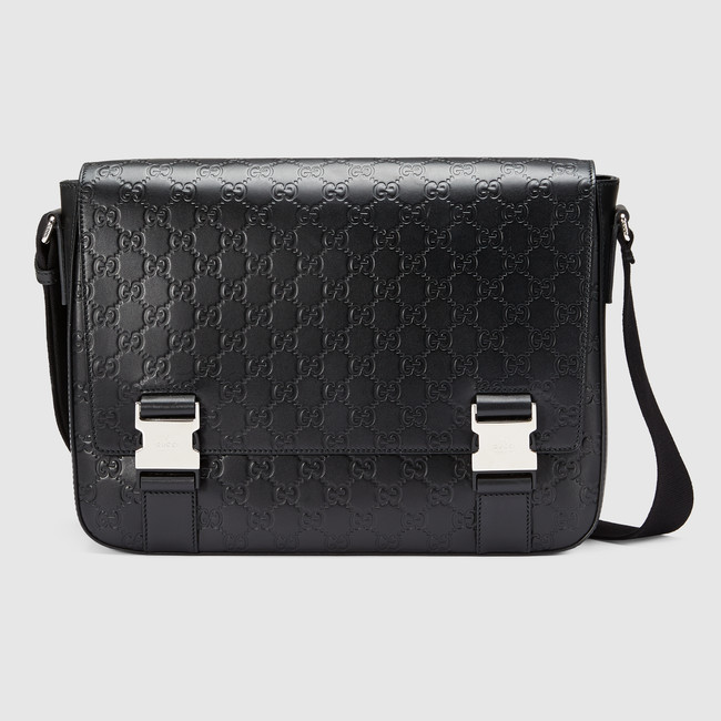 A medium size messenger bag with a flap closure that secures with two metal buckles engraved with our Gucci trademark. Made in our heat embossed Gucci Signature leather resulting in a defined print with a firm texture.