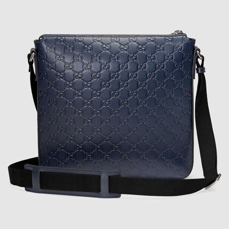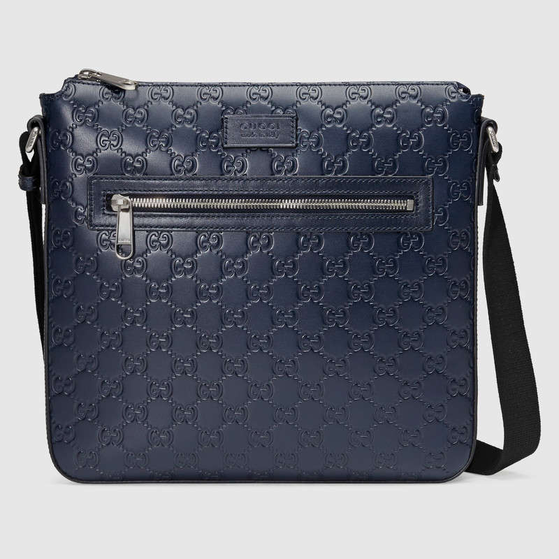 A medium size flat messenger bag with a zip closure and front zip pocket. Made in heat debossed Gucci Signature leather with a defined print and firm texture.