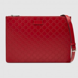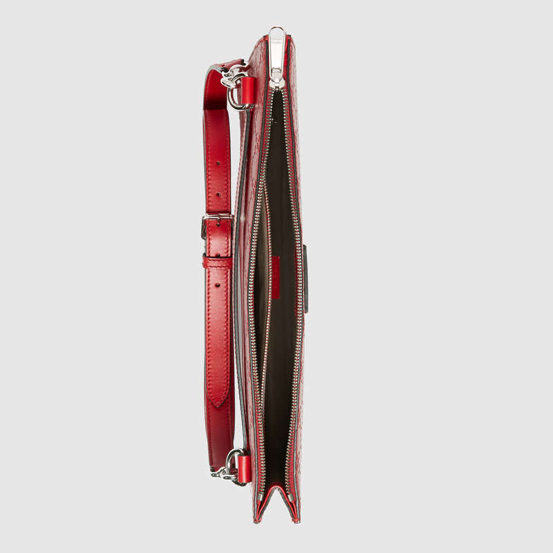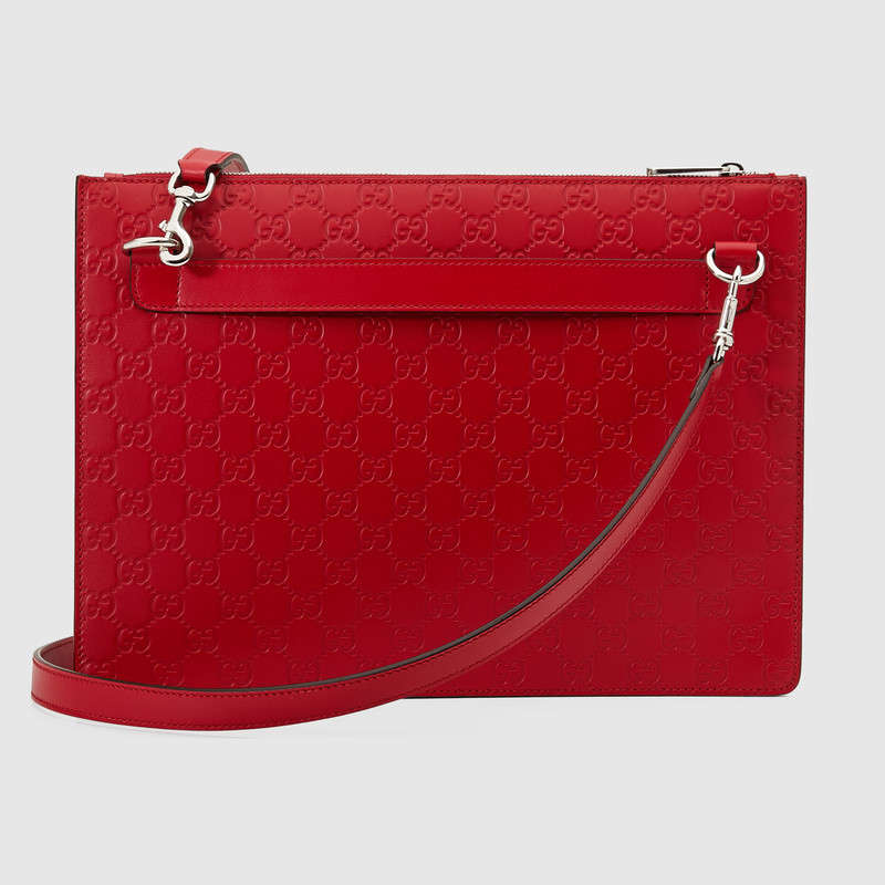 A slim messenger designed to be worn multiple ways, featuring an adjustable leather shoulder strap and a leather handle at the back of the bag. Made in heat debossed Gucci Signature leather resulting in a defined print with a firm texture.