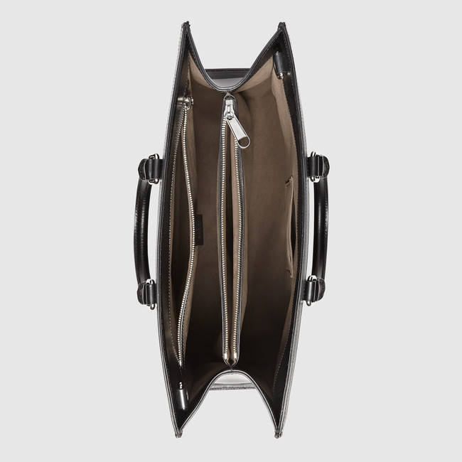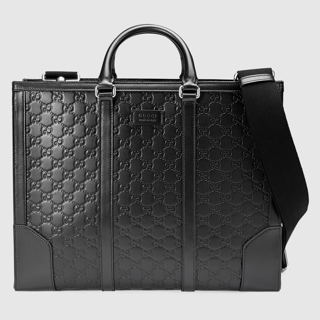 A structured wide tote made in our heat embossed Gucci Signature leather resulting in a defined print with a firm texture.
