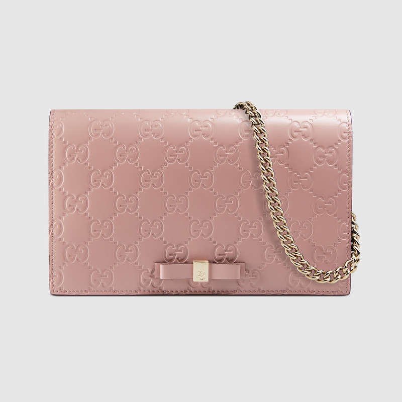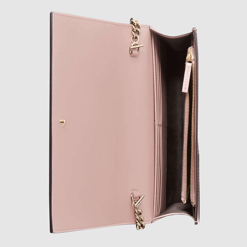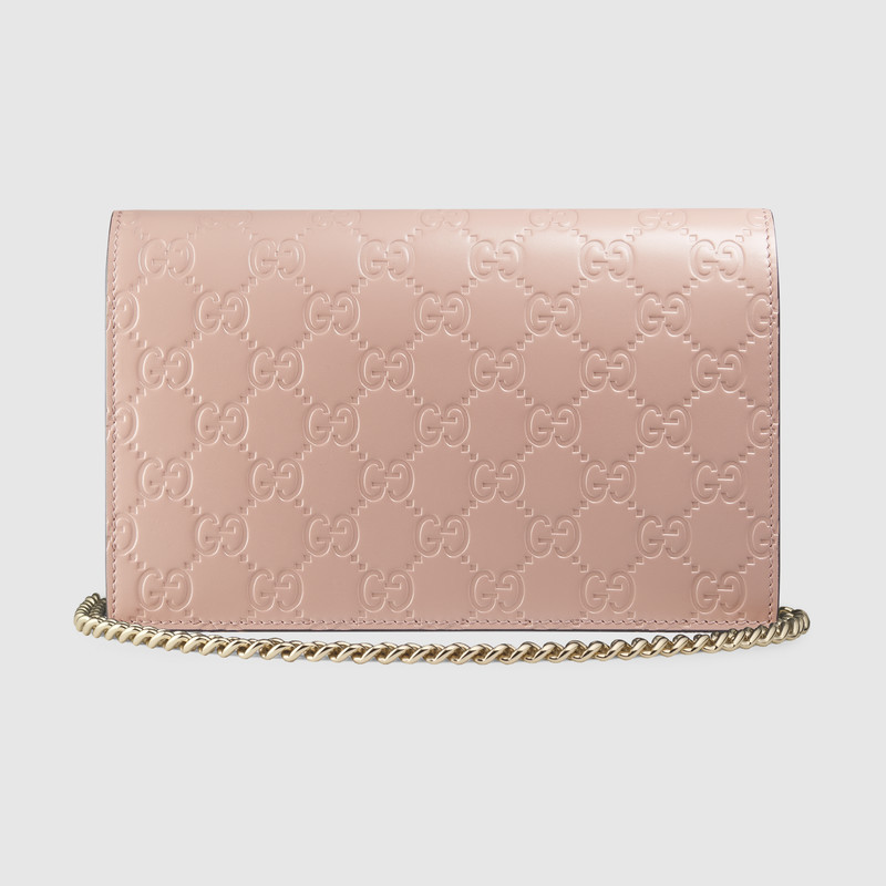 A mini chain bag with an external side pocket under the flap that holds a smartphone. Made in heat debossed Gucci Signature leather resulting in a defined print with a firm texture.