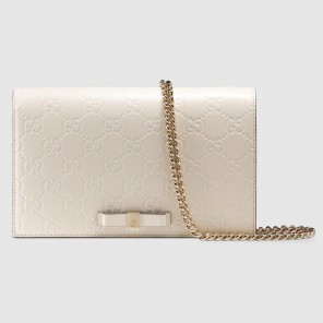 A mini chain bag with an external side pocket under the flap that holds a smartphone. Made in our heat embossed Gucci Signature leather resulting in a defined print with a firm texture.