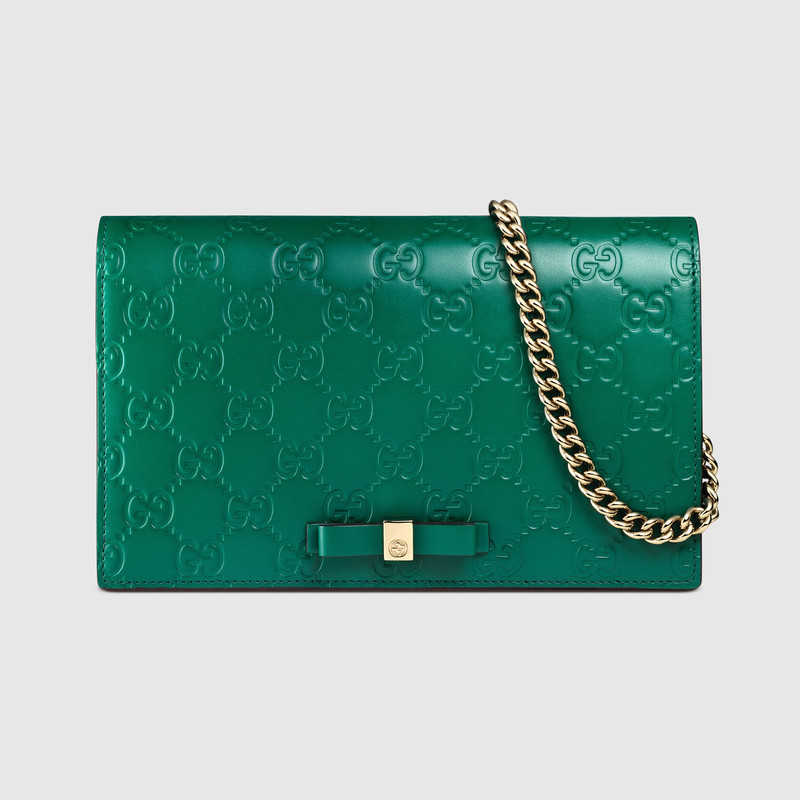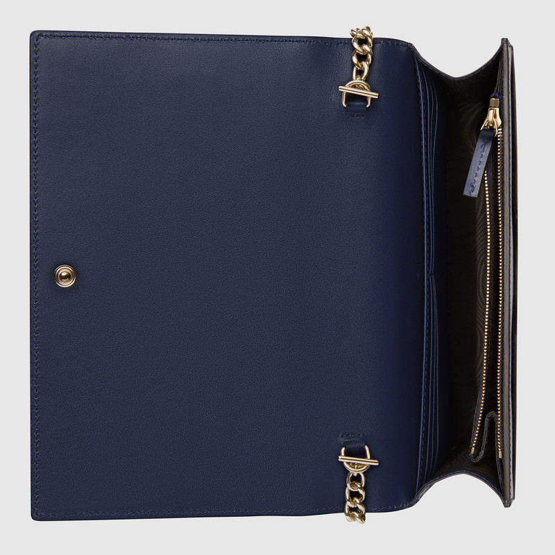 A mini chain bag with an external side pocket under the flap that holds a smartphone. Made in heat debossed Gucci Signature leather resulting in a defined print with a firm texture.