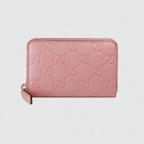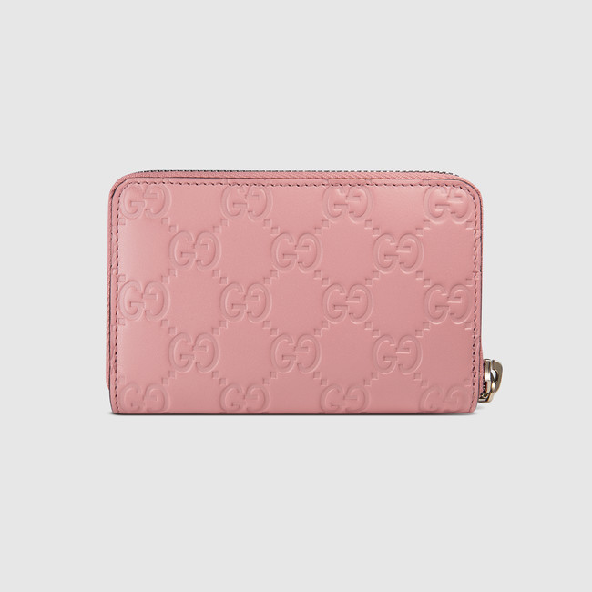 - Pink Gucci Signature leather with pink leather detail- Gusseted sides- Three compartments- Zip around closure- Mini