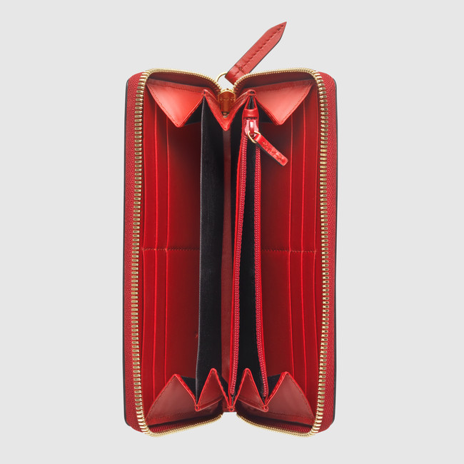 A zip around wallet with a flap and snap closure. Made in our heat embossed Gucci Signature leather resulting in a defined print with a firm texture.