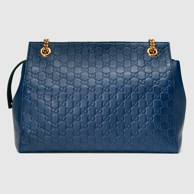 A large shoulder bag with a softly structured shape. The chain straps have a leather shoulder detail. Made in heat debossed soft Gucci Signature leather with a defined print and firm texture-an update to the classic Gucci Signature leather with a softer construction.