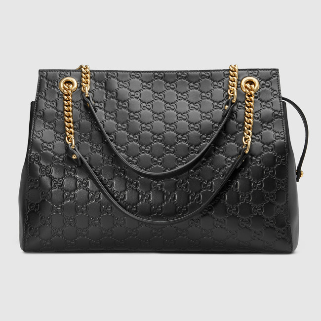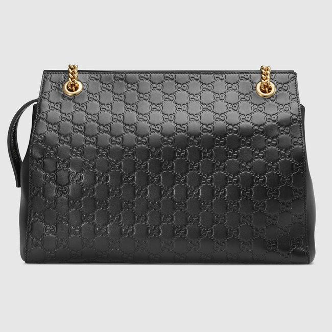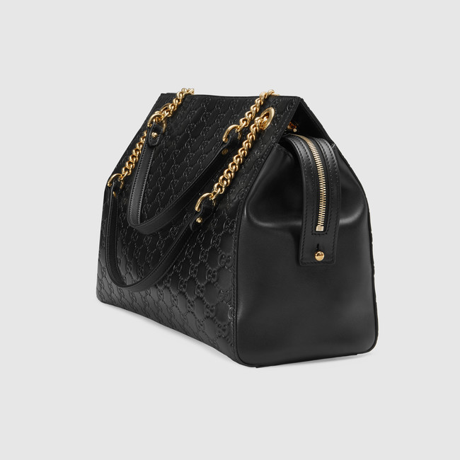 A large shoulder bag with a softly structured shape. The chain straps have a leather shoulder detail. Made in heat debossed soft Gucci Signature leather with a defined print and firm texture-an update to the classic Gucci Signature leather with a softer construction.
