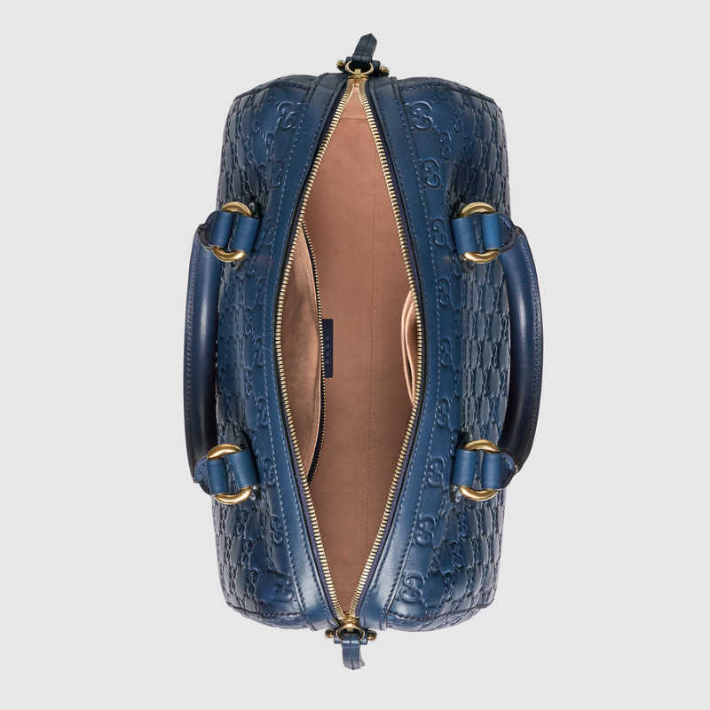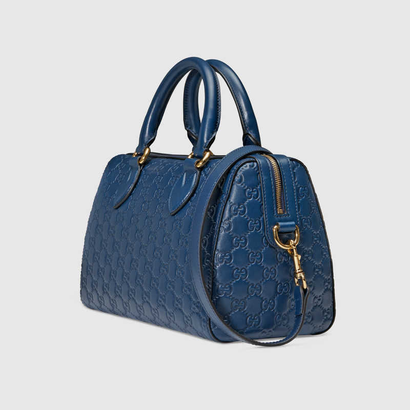 A medium boston bag with a softly structured shape. Made in heat debossed soft Gucci Signature leather with a defined print and firm texture-an update to the classic Gucci Signature leather with a softer construction.