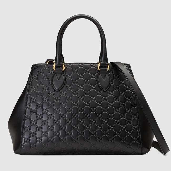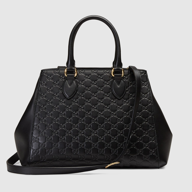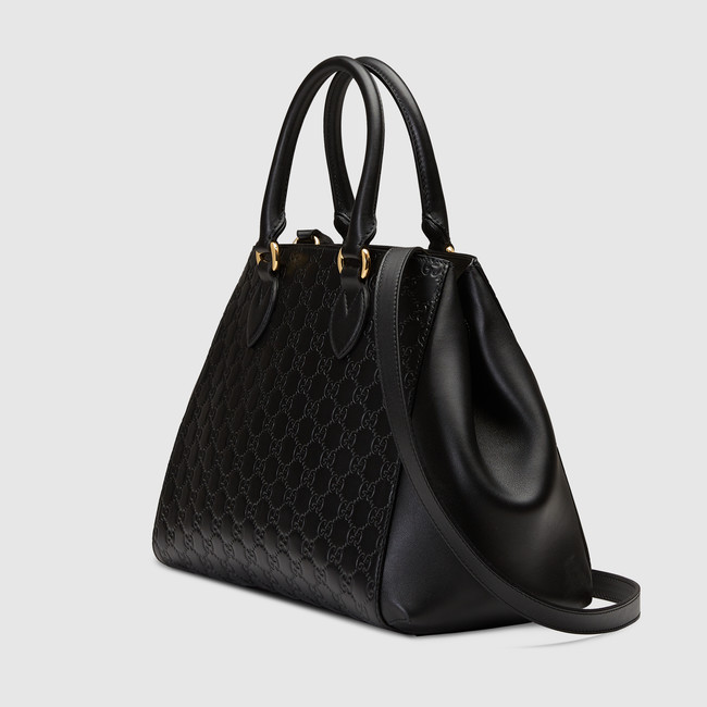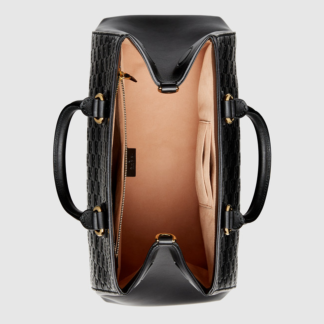 A large top handle bag with a softly structured shape. Made in heat debossed soft Gucci Signature leather with a defined print and firm texture-an update to the classic Gucci Signature leather with a softer construction.
