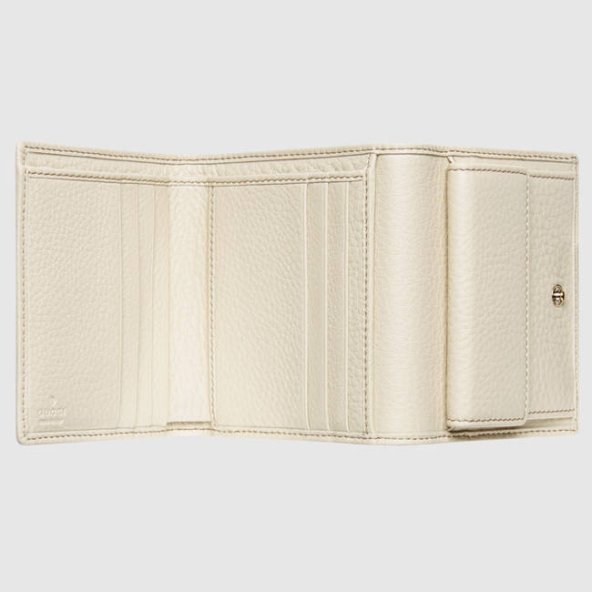 - White leather- Embossed interlocking G detail- Six card slots, one bill pocket and coin purse with snap closure- Snap closure- Mini