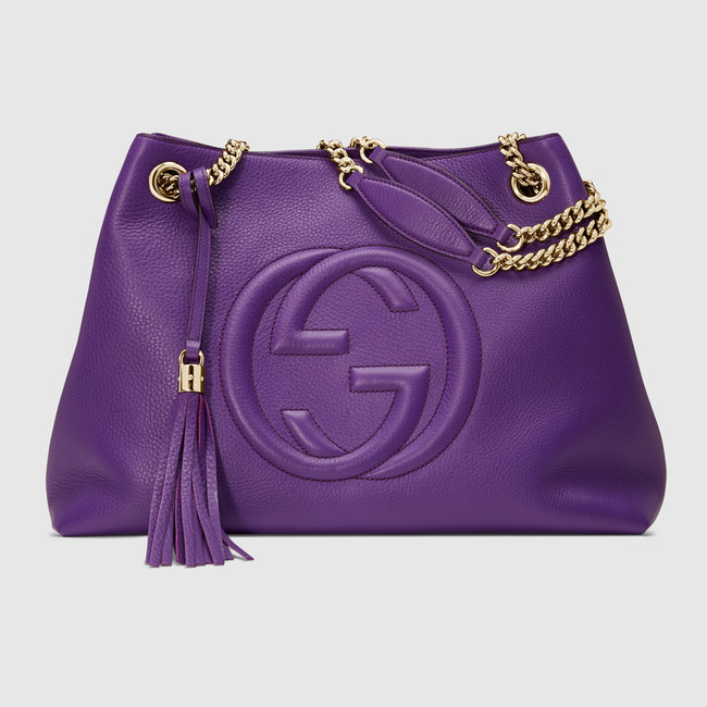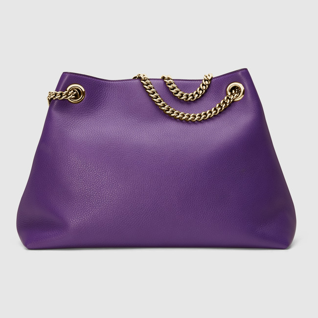 A medium size Soho shoulder bag with double chain shoulder straps and an embossed interlocking G. Made in our light, natural grain leather.
