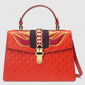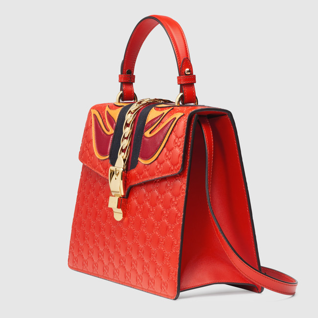 The Sylvie bag in a top handle shape with the nylon Web embedded under the Gucci signature leather and decorated with a gold chain and buckle. The bag is further enhanced by inlaid leather flames. Made in heat debossed Gucci Signature leather resulting in a defined print with a firm texture.