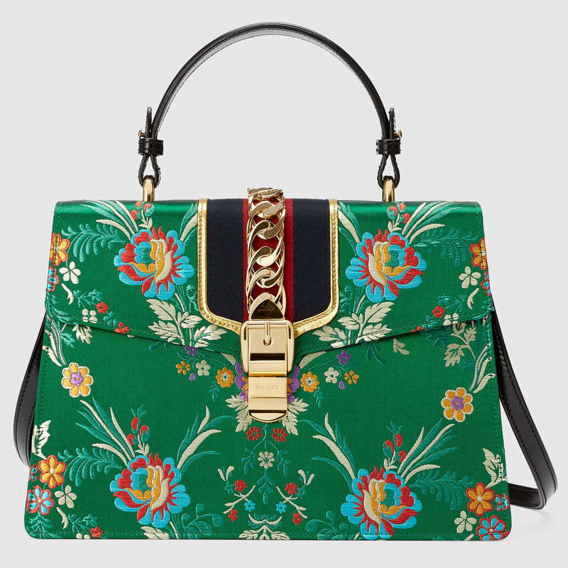The Sylvie bag in a top handle shape with nylon Web embedded under the fabric and decorated with a gold chain and buckle. The metal buckle closure was taken from the House鈥檚 archives, and is mixed playfully with the Web stripe. Made in a new floral jacquard fabric with colorful flowers on a green background.