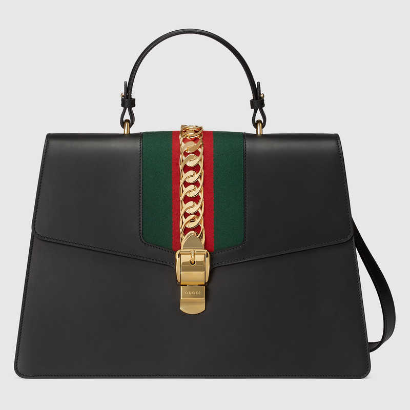 The Sylvie bag in a new Maxi top handle shape with a metal buckle closure taken from the House鈥檚 archives and mixed playfully with the Web stripe. Made in our smooth, classic leather.