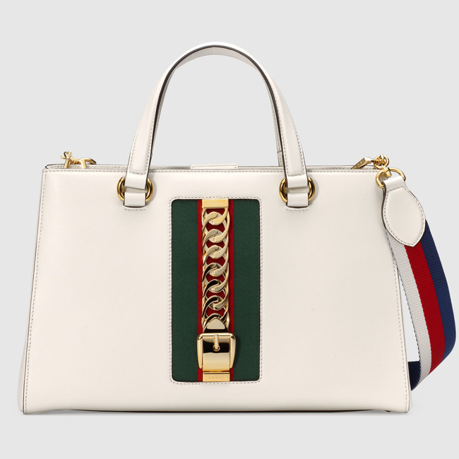 A new addition to the Sylvie collection, this top handle shape features nylon Web straps finished with metal tips. The Gucci Web is also embedded under the leather and decorated with a gold chain and buckle. Made in smooth leather.