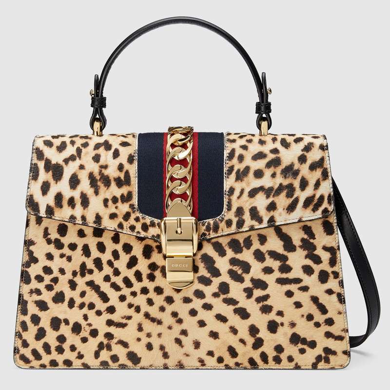 The Sylvie bag in a top handle shape with nylon Web embedded under the calf hair and decorated with a gold chain and buckle. The metal buckle closure was taken from the House鈥檚 archives, and is mixed playfully with the Web stripe. Made in leopard printed onto calf hair.
